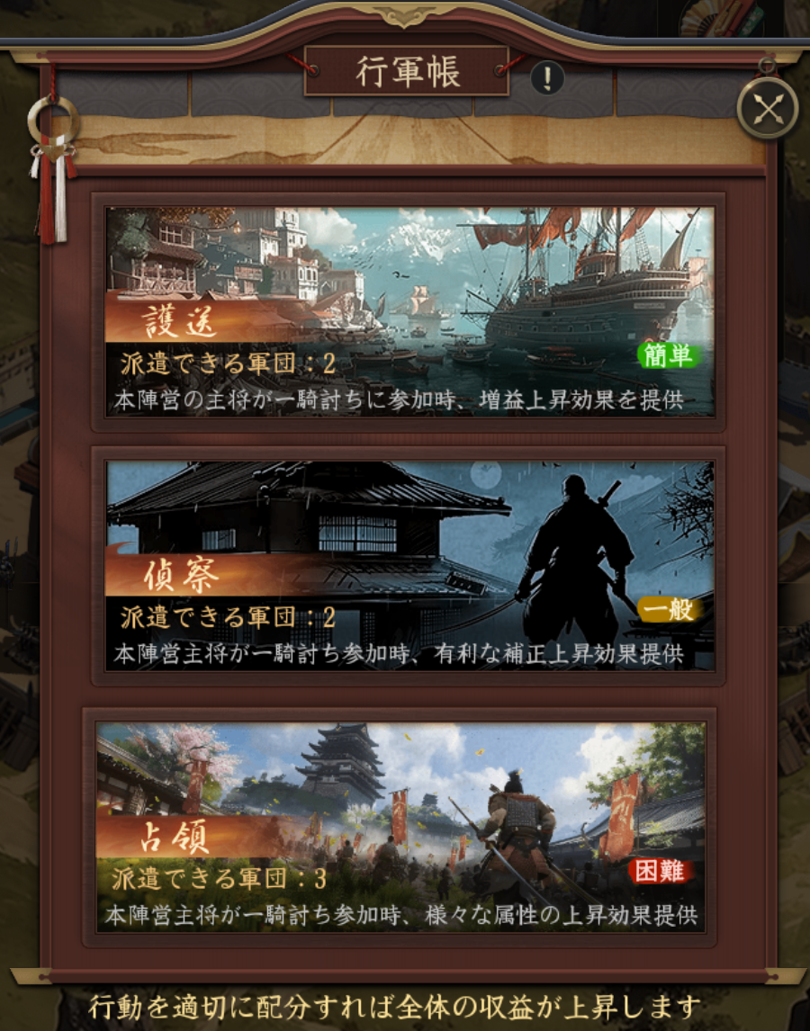 • 【2】行軍帳建築では軍団を派遣してさまざまな行動に参加します。
