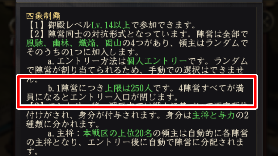 b. 1陣営につき上限は250人です。4陣営すべてが満員になるとエントリー入口が閉じます。